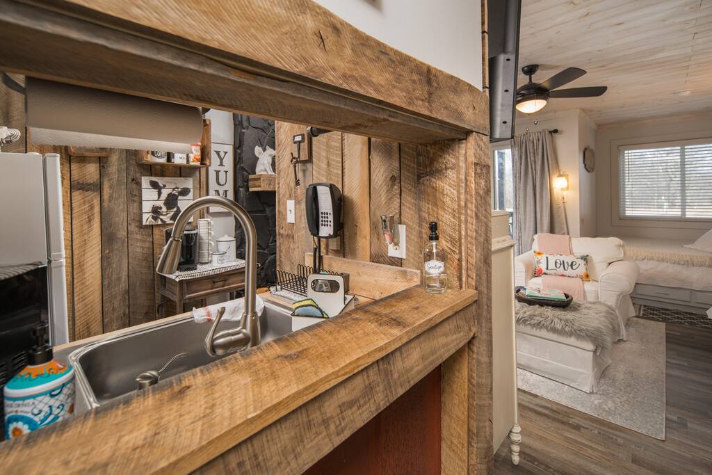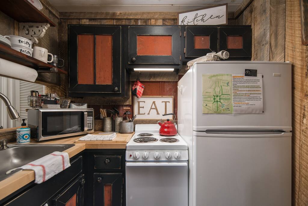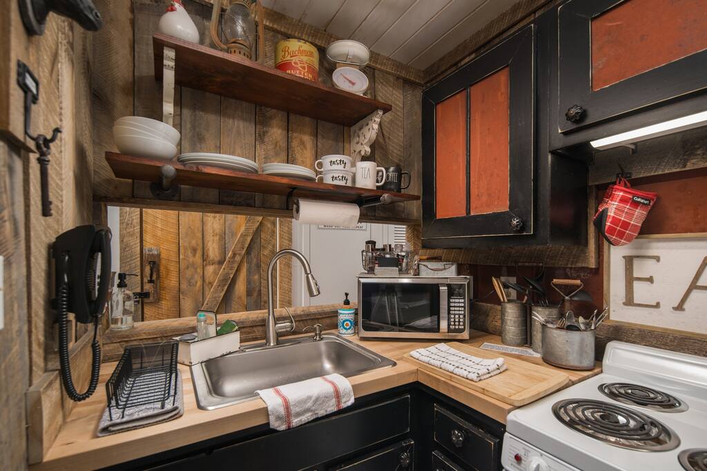 The fully stocked kitchenette includes everything you need for simple meals and morning routines: