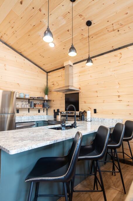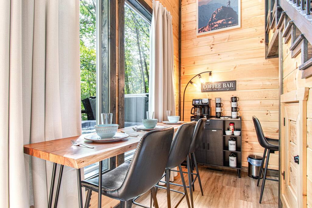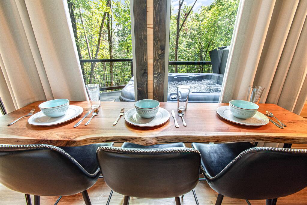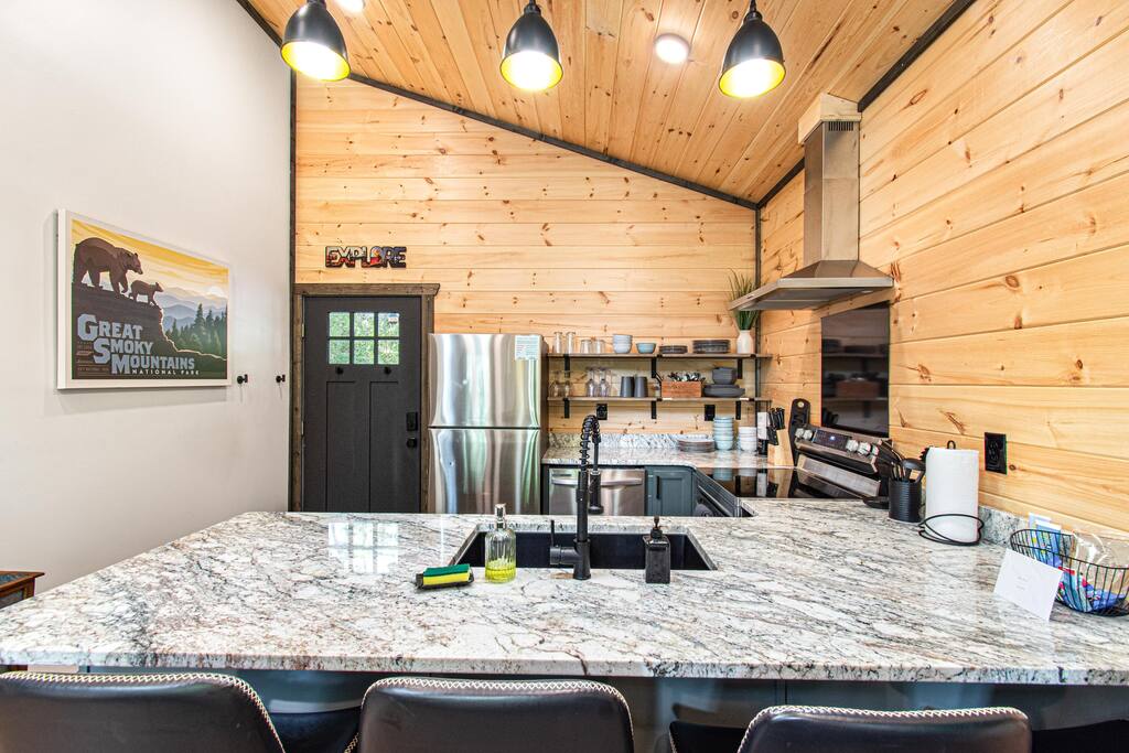 •Breakfast bar and rustic dining table—gather for a meal, a board game, or planning your next Smoky Mountains outing.