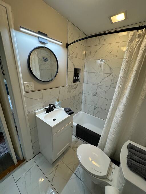 The home features a fully remodeled Jack-and-Jill bathroom located between the two bedrooms. It includes a tub/shower combo, modern vanity, and all new tile. The space is compact but thoughtfully designed to maximize function and comfort.