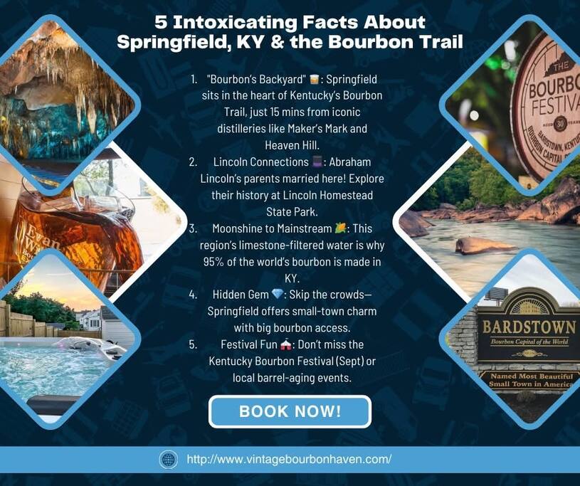 Welcome to Vintage Bourbon Haven, your ideal Kentucky Bourbon Trail getaway in Springfield, KY — just 20 minutes from Bardstown and a short drive to the most iconic distilleries in Bourbon Country. Whether you’re here for tastings, concerts, festivals, or a relaxing escape, this home is designed so you can sip by day and soak by night.